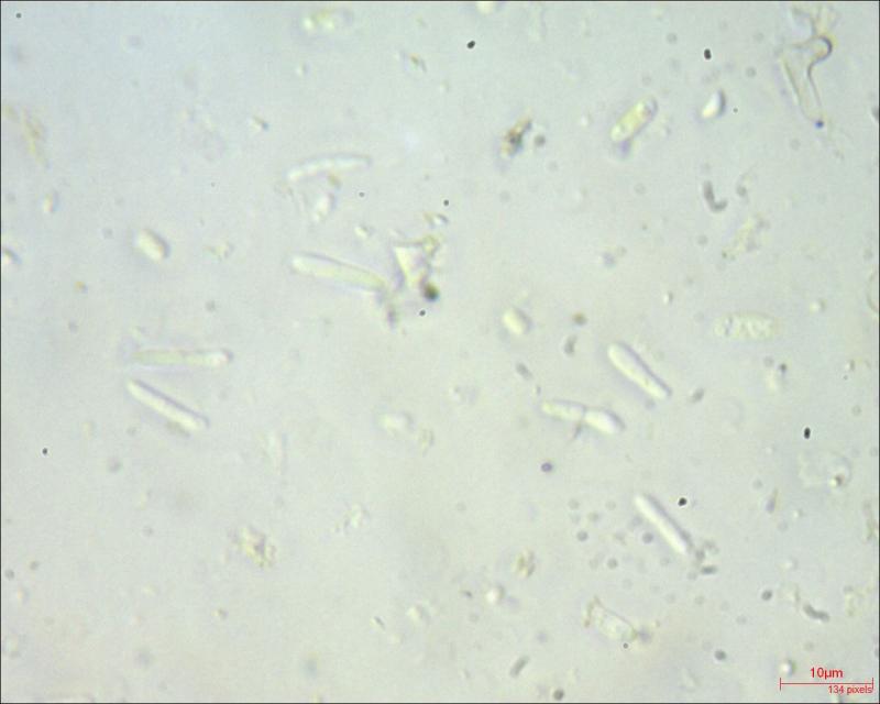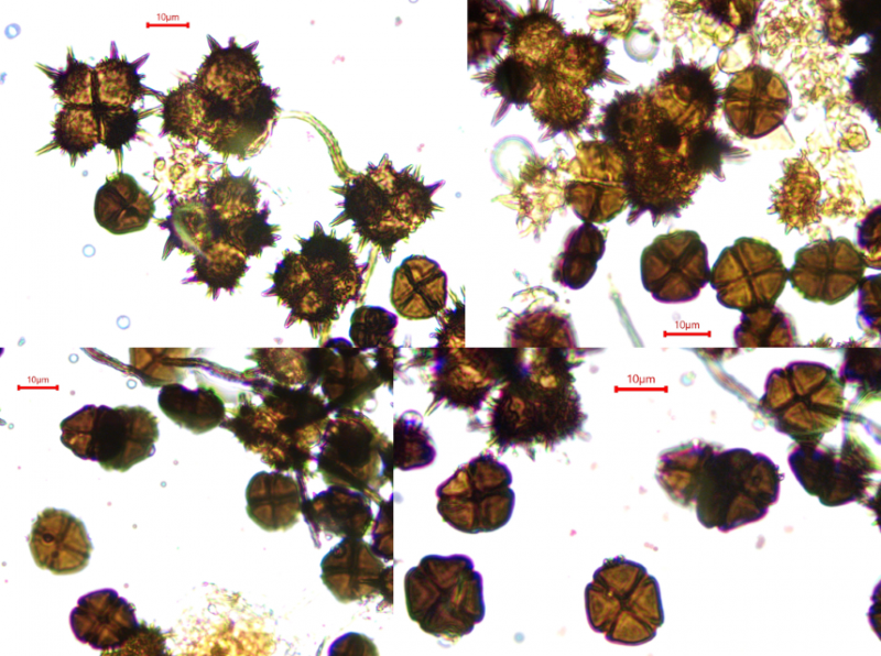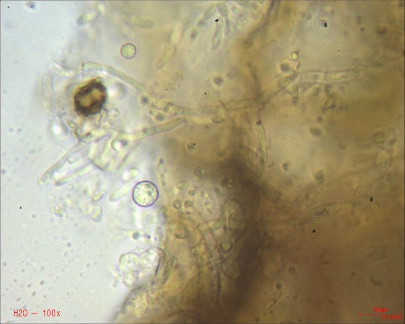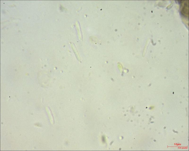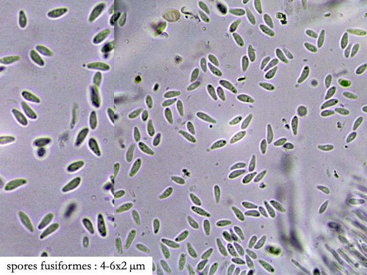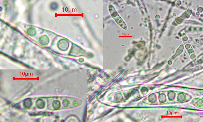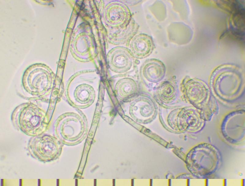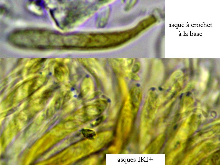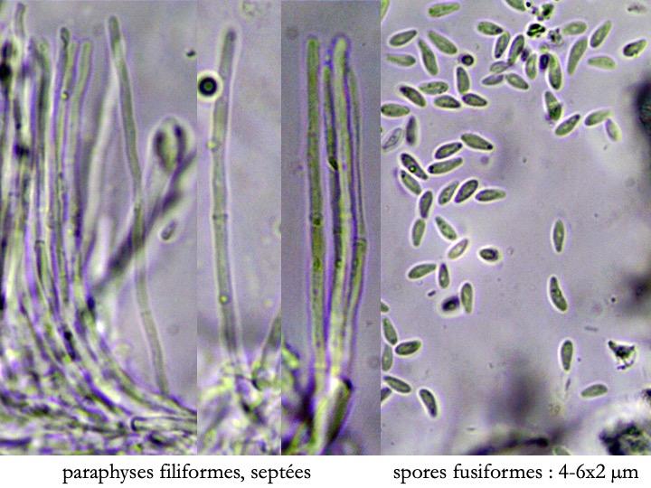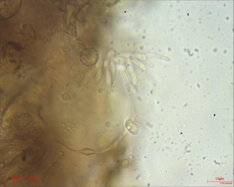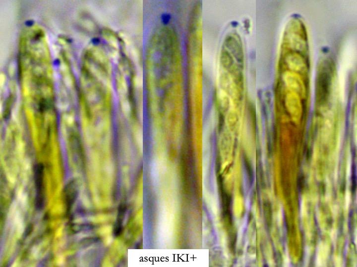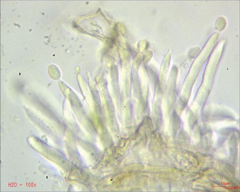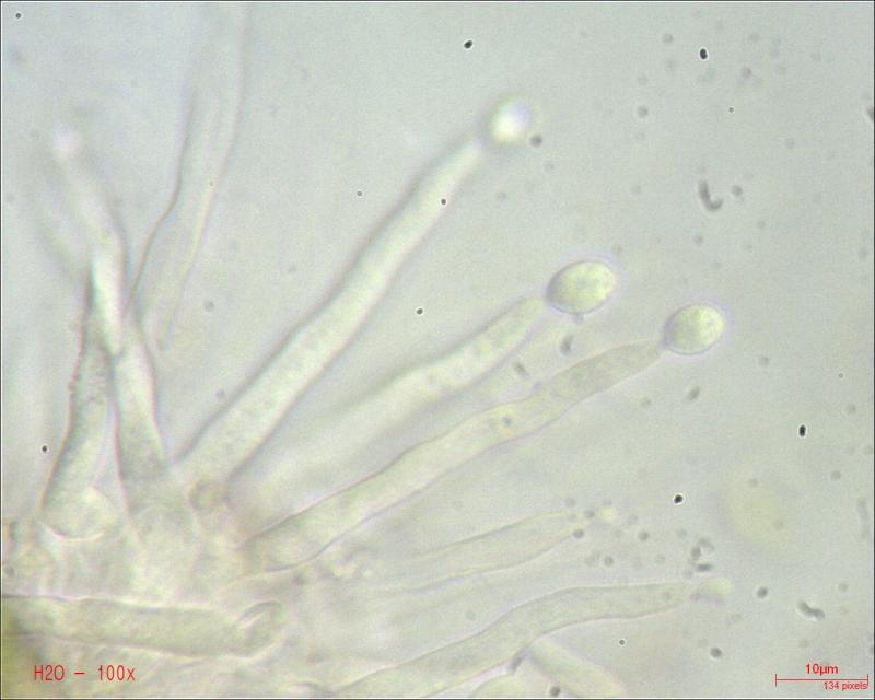 This Pyrenopeziza grew in moist leaves of monocot. (Carex?) in a coastal lagoon in northern Spain. The apothecial margin is very briefly pubescent with short chains of cells with a clavate or broad bullet-shaped terminal element. Asci IKIb asci arising from croziers. Ascospores clavate with a broad obtuse base and a narrower, pointed apex. The lipid content is low or very low, consisting of only a few fine droplets near the poles (OCI=0-1) and remnants of a small apical gelatinous sheath that soon disappears (red arrowed). The paraphyses appear to have very little content and their apices possess an amorphous, almost hyaline or yellowish substance that reacts reddish in IKI. Excipulum textura globuloso-angularis texture of greyish cells.