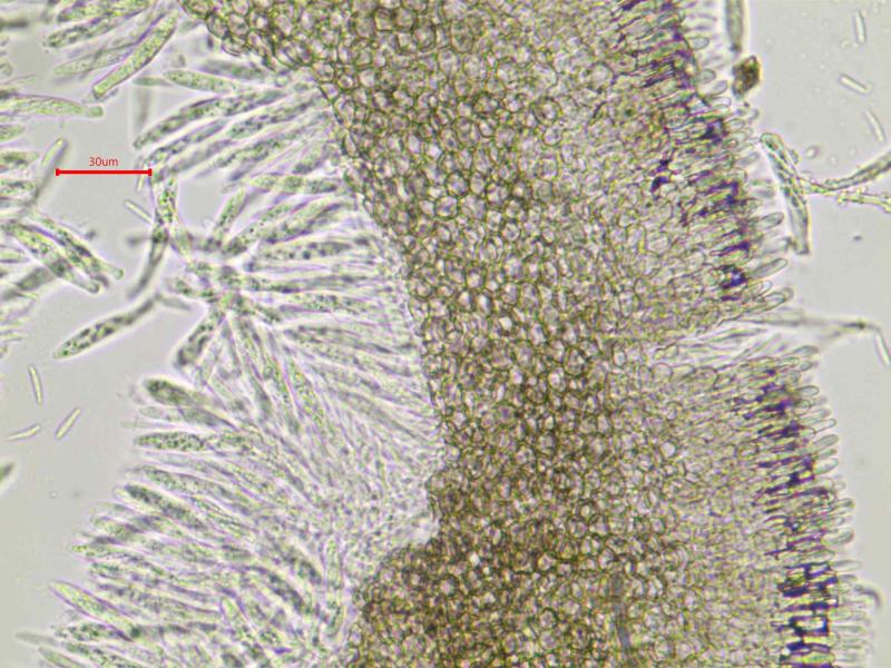 I searched for croziers, and couldn't find any (but they are not always easy to see). Unfortunately I have no IKI, so I couldn´t check the reaction. Anyway - the substrate (Carex) is a bit confusing. There was a discussion about H. ombrophiloformis vs. syingaecolor in Ascomycetes of the world a year ago. Björn Wergen wrote that he was convinced that "there are additional undescribed species, growing on different substrates, all under the name 'H. syringaecolor'." Maybe that´s the problem? Now I will look for croziers a second time, and I´ll see if I can check the IKl reaction as well.