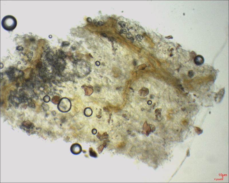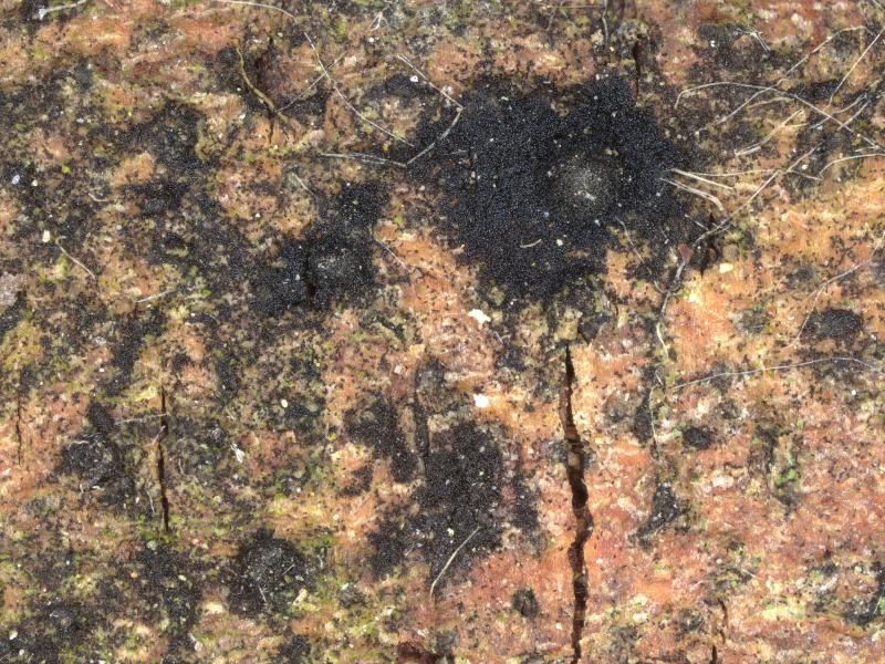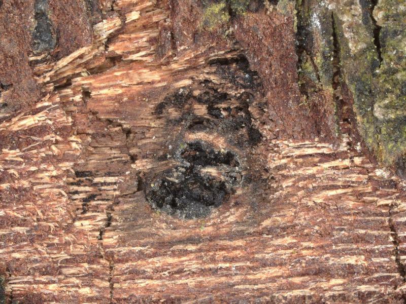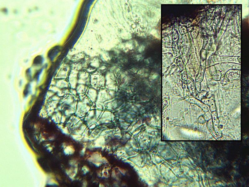 The fungus occurred mainly on the dark brown necroses in the leaf. Less frequently, it also occurred on the yellow zones surrounding the necroses. It consisted of orange, glassy Nectria-like spheres. Inside was a mass of cylindrical conidia, some connected in a chain-like manner.