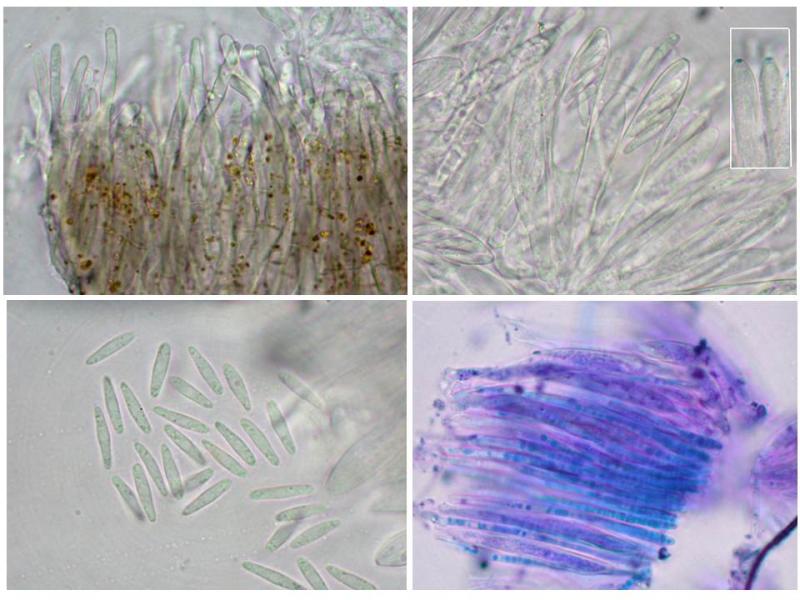 Asques issus de crochet , octosporés, unisériées ,parfois bisériées, IKI- , longueur 80µm moyenne