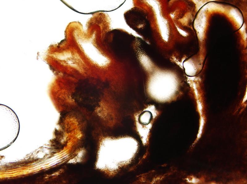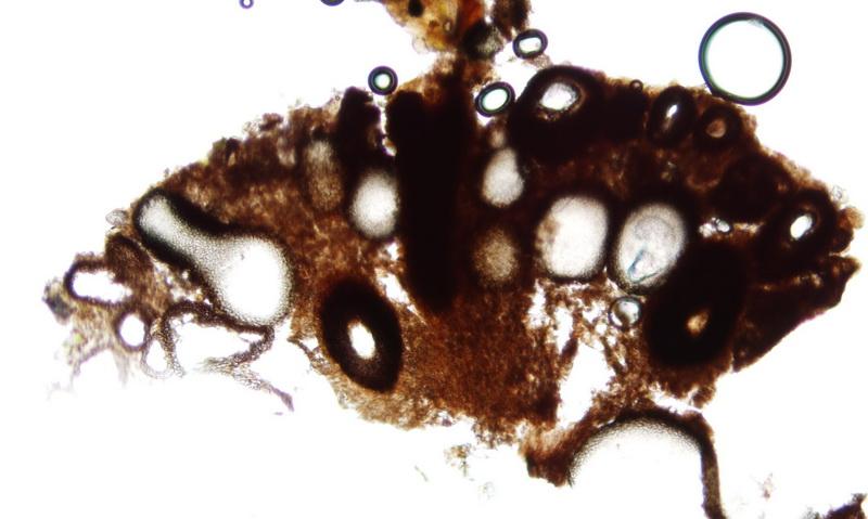 I'm looking for help with another peculiar ascomycete. This one grows on bark of a Tilia branch that recently fell on the ground. Its pseudothecia (I assume) are rather irregularly immersed in soft, brown, stromatic tissue. The loose arrangement of the pseudothecia can be seen well in vertical section. The 8-spored asci appear bitunicate to me. The ascospores are 1-septate, somewhat fusoid, and measure about 20.5–25.8 x 5.2–6.4 µm. Maybe someone recognizes this fungus!