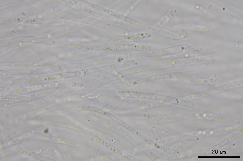 Esporas de color marrón, más o menos fusiformes o naviculares de (29,4) 31,8 - 41,1 (42,5) × (9,6) 10,3 - 12,7 (13,8) µm, Q = (2,4) 2,9 - 3,7 (4,1), N = 38, Me = 36,3 × 11,4 µm, Qe = 3,2, con una ranura germinativa en espiral, un pequeño apéndice hialino en un extremo y varias gotas de aceite en su interior.