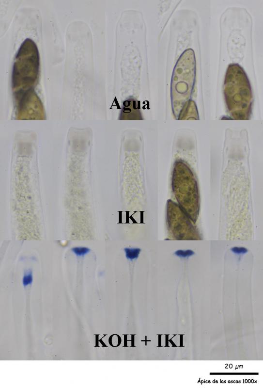 Ascas cilíndrico-claviformes de(137,7) 140,8 - 162,3 (162,5) × (20,4) 20,9 - 24,7 (24,9) µm N = 11, Me = 154 × 22,7 µm, con 8 esporas irregularmente biseriadas y un aparato apical hemiamiloide.