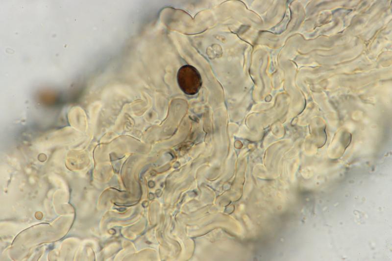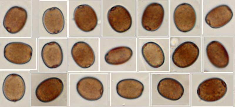 Spores (6.6) 6.8 - 7.6 (7.8) × (4.9) 5.4 - 6.3 (6.5) µm; Q = (1.1) 1.13 - 1.3 (1.5) ; N = 22; Me = 7.2 × 5.8 µm ; Qe = 1.2