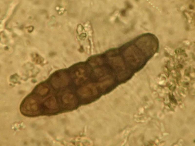 Spores with many segments, 54-65 x 15-17 my, dark.