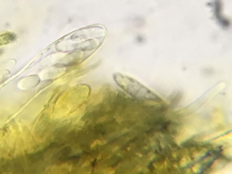 Spores aseptate in the ascus and considerably smaller than the (sometimes) 1-septate loose spores that were present, 9.4-15.7 x 3.2-4.1µm