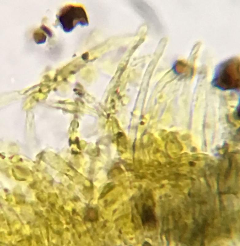 The apothecia are very small, probably 0.2-0.4mm with bright green hairs and an olive green hymenium.