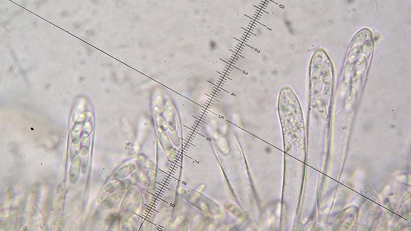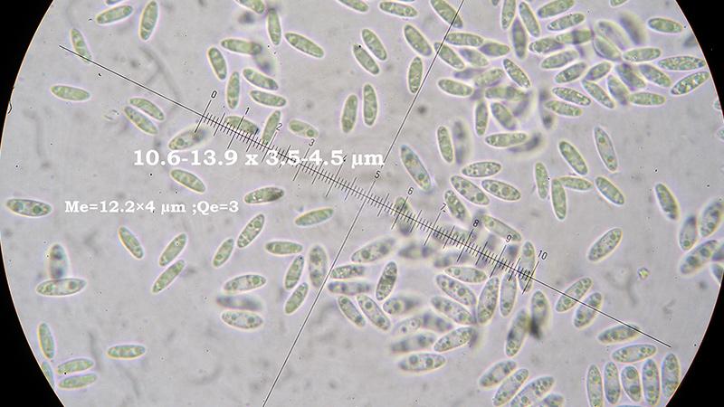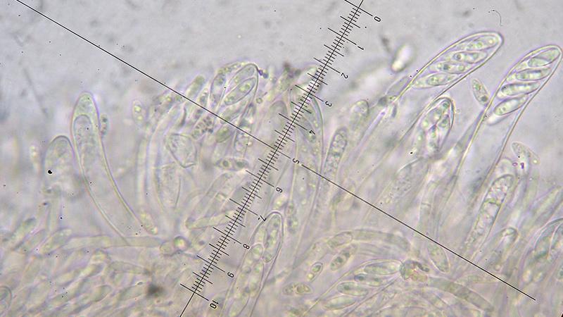 Octosporic asci with amyloid apical pores. Fusiform spores, smooth sometimes with a septum, measuring 10.6-13.9 x 3.5-4.5 µm.