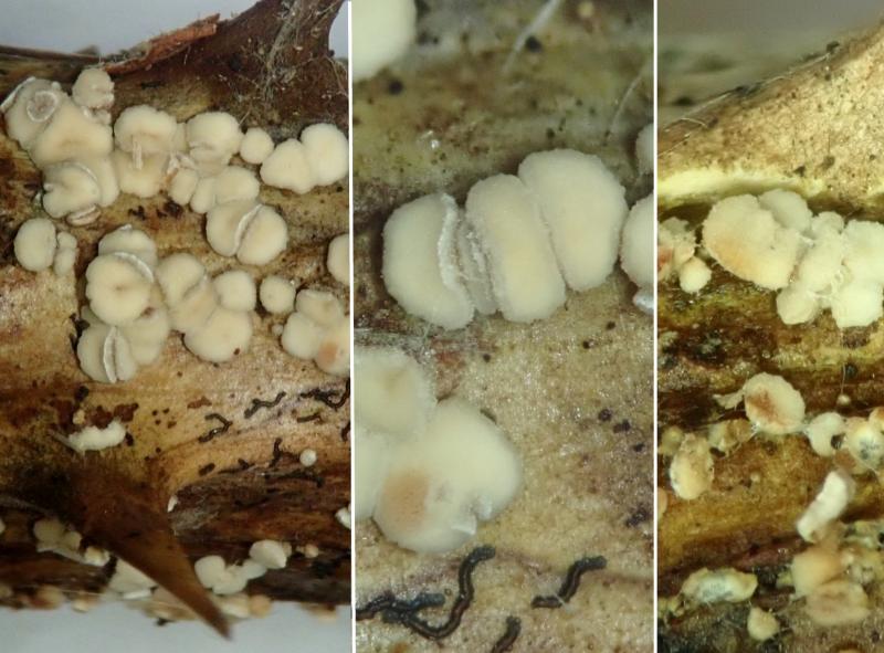 Apothécies blanchâtres à crème, sessile, fixée par un point noir au support