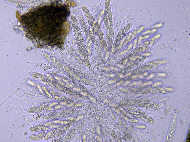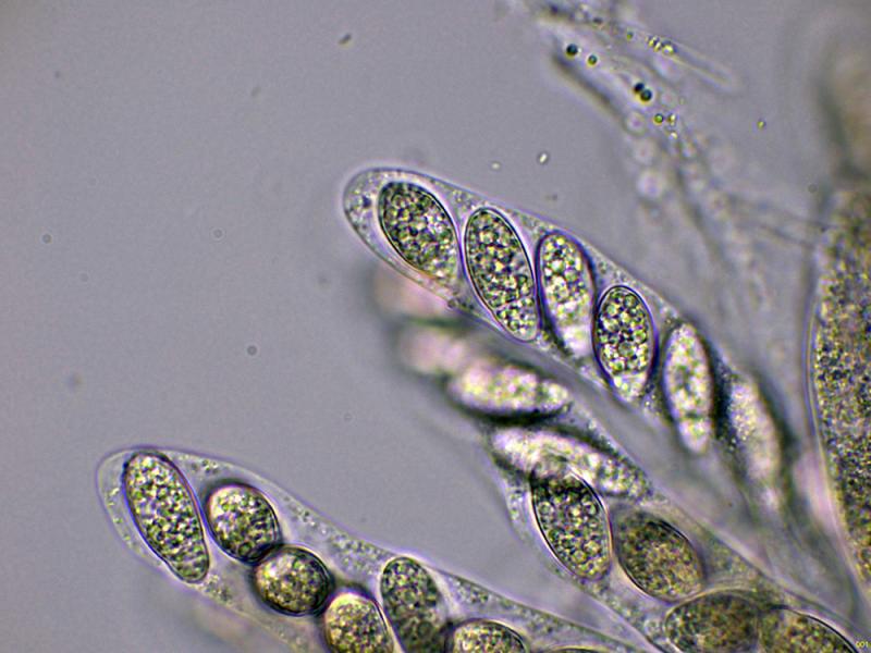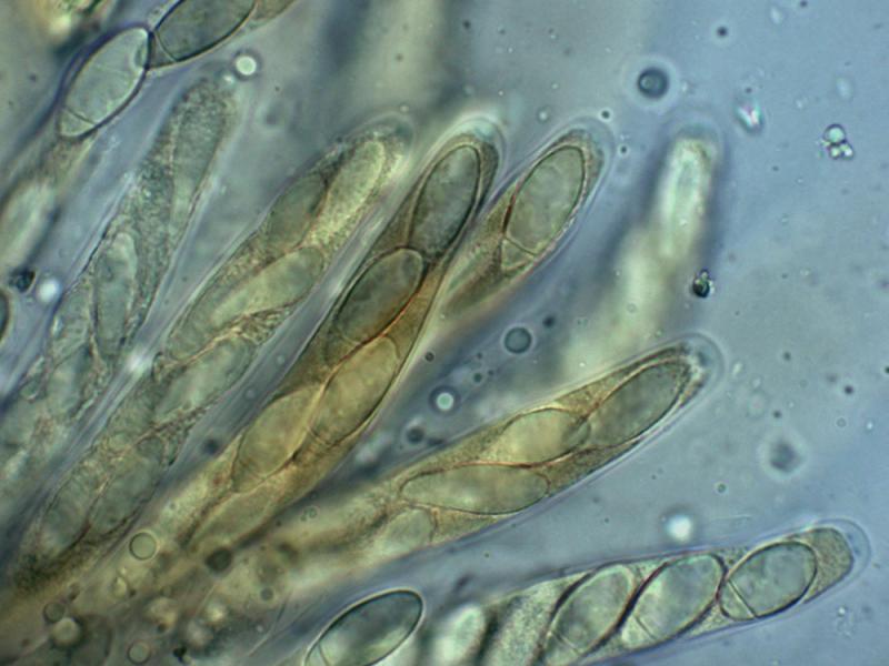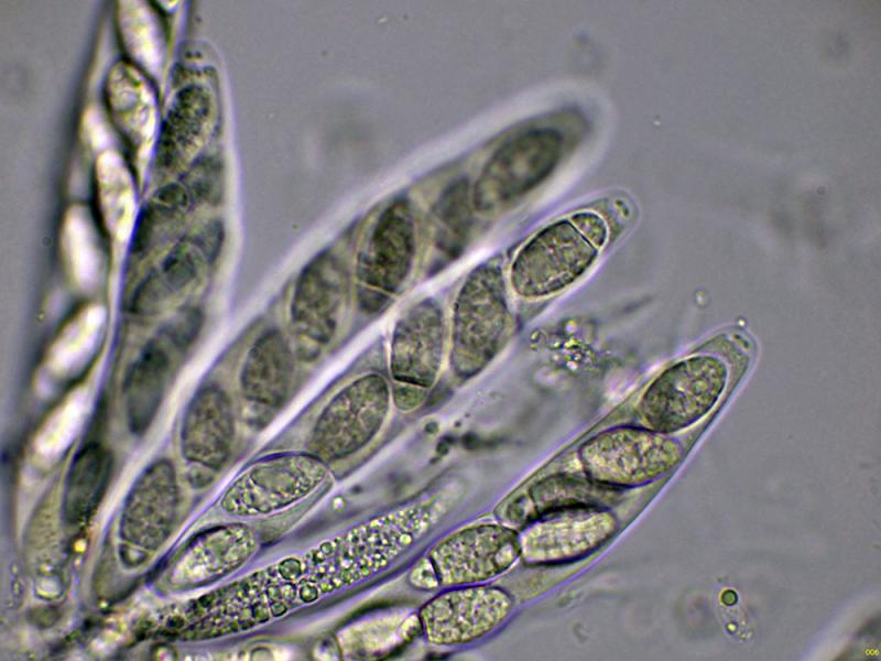 Spores between ellipsoid and fusiform, with one more pointed end and a septum near this end, this septum being more visible using Melzer's reagent. Measurements in water of the mature spores measured within the ascus are: