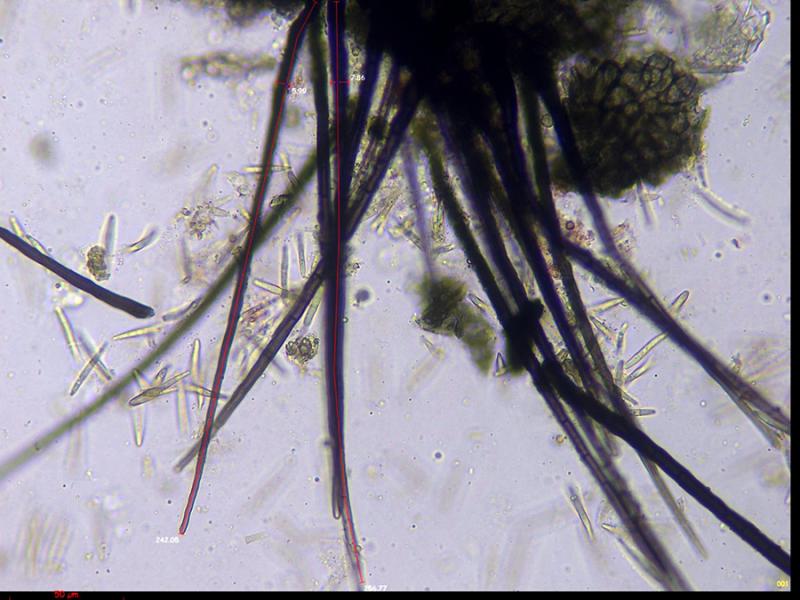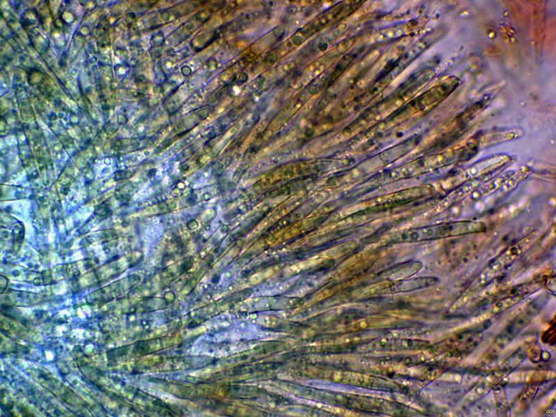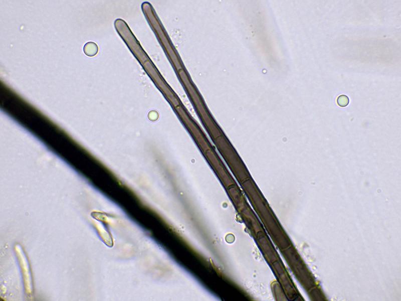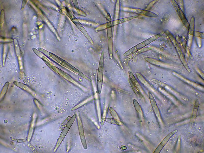 Conidiogenous hyphae are difficult to observe, but a vertical palisade arrangement is discernible. These hyphae produce fusiform conidia with a more pointed end, mostly with two septa and, exceptionally, some with three. These septa are more visible in Melzer's reagent and show no signs of constriction. Measurements of these conidia in water are: