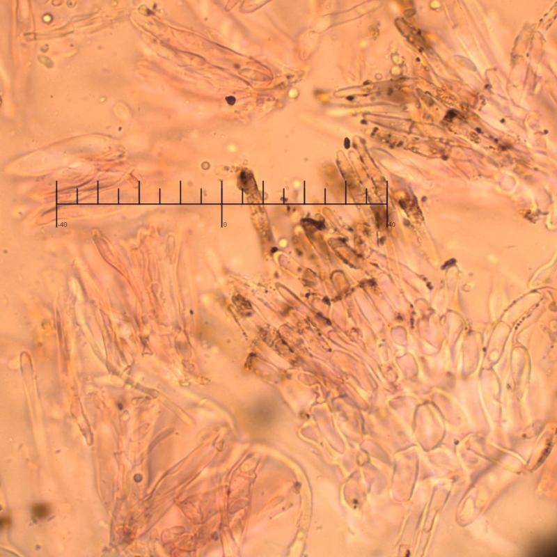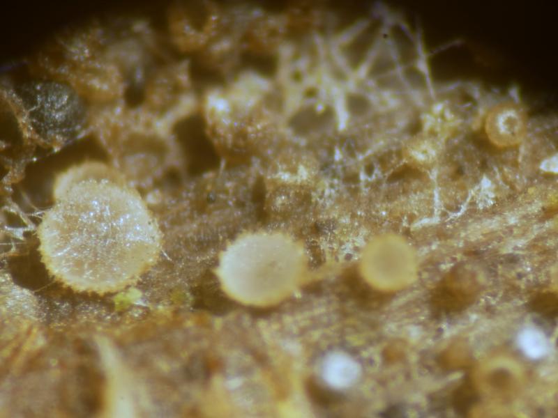 Discus up to 0.25mm, sessile, on the edge somewhat coronat hairy. Excipulum hairy. Hairs multicelled, the outer cells with dark grains on the surface.