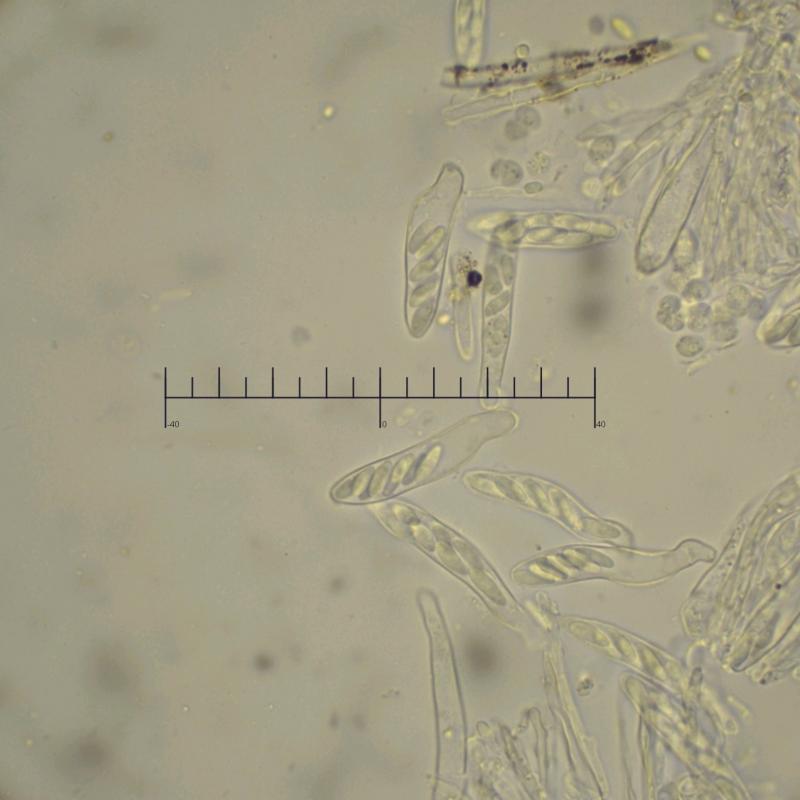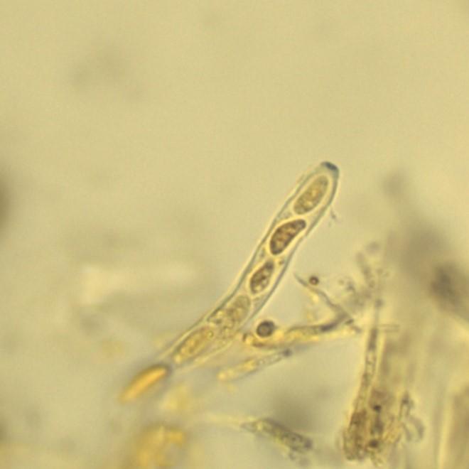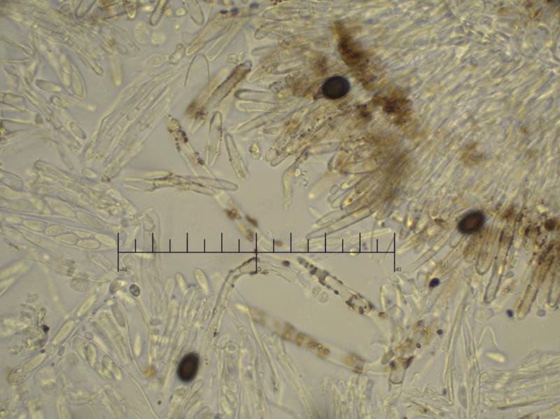 Spores brownish, typically 4-celled; 26.8 x 2.4;