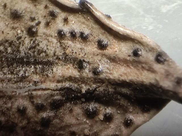 - Conidiomata black, pustular, on both sides of the leaf but mainly on the underside, 0,2-0,4 mm Ø; few specimen were sparsely 'hairy' (see photo's 5 and 6)