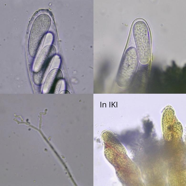 Asci with croziers, measuring 172-182 x 24,6-32 µm (living) and 160-189,5 x 19,7 µm (dead). IKI-