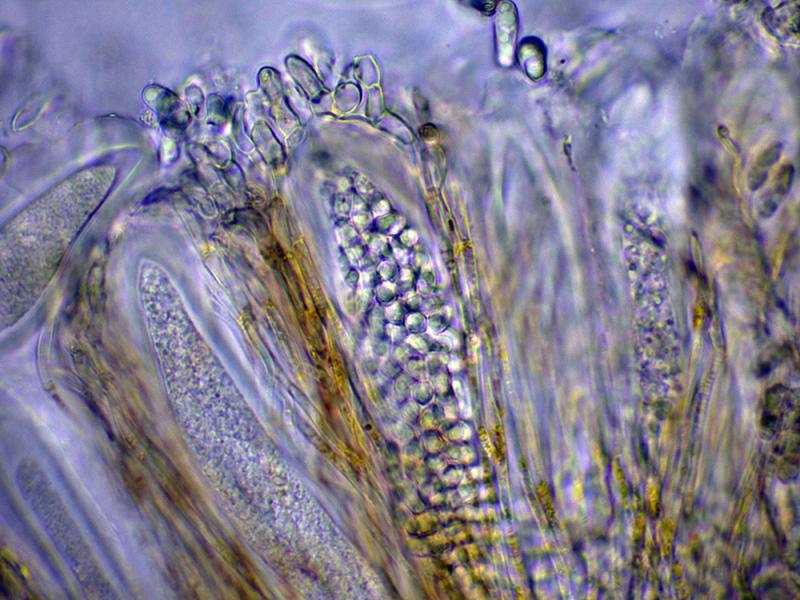 Sparse asci, containing more than 100 ascospores, with no apparent reaction to Melzer's reagent. Thread-like paraphyses with yellowish intracellular pigment, not protruding above the level of the asci, with short, broadened septa at their ends.