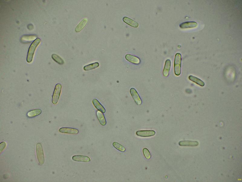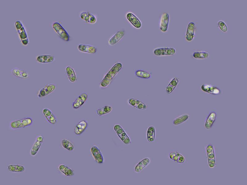 Cylindrical ascospores with large lipid droplets inside and with the following measurements of free ascospores in water:
