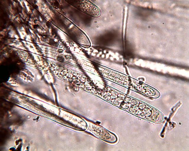 Esporas al principio enteras dentro del asca, despues fragmentadas dentro del asca para ser expulsadas.
