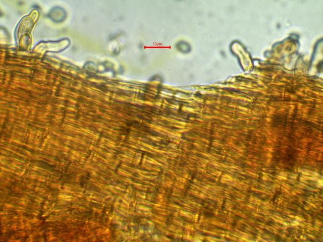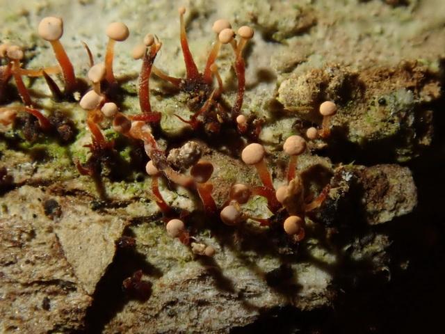 Une anamorphe rose stipitée, très nombreux synnema, stipe surmonté d'une tête globuleuse, stipe velu brun rouge plus foncé en bas, avec excroissances simples hyalines cylindriques à sinueuses, obtuses, à paroi épaisse parfois uniseptées, plus nombreuses vers la base, qqs unes plus longues branchues et septées (1-3 cloisons) à l'extrême base, le stipe de textura porrecta, hyphes colorés vers l'ext et incolores à l'int., hyphes stériles du stipe septés semblent pénétrer à l'intérieur du capitulum, capitulum conidiogène, conidiophore verticillé, conidies hyalines ou peu colorées, rose en masse, à paroi épaisse, ellipsoïdes lisses, 5-6x2.5-3.5µ, se formant à l'extrémité des branches du conidiophore, sur tronc mort debout de feuillu (frêne ?), en boisement riverain de Chalosse (40)