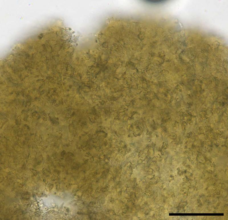 apparent associated anamorph forming small, dark, pulvinate growths at the base of apothecia (micrographs forthcoming).