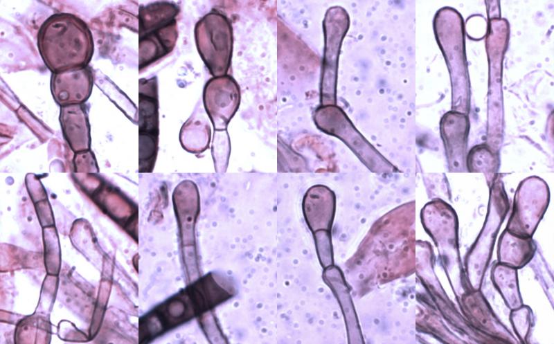 Malcolm  GreavesThis Geoglossum had spores mostly 70-80 (87) with 7 septa. The first couple of paraphyses I found with short bulbous elements made me think it was just cookeanum but alomost all the rest were swollen but with wider septation than I would have expected in this species.