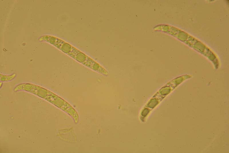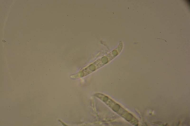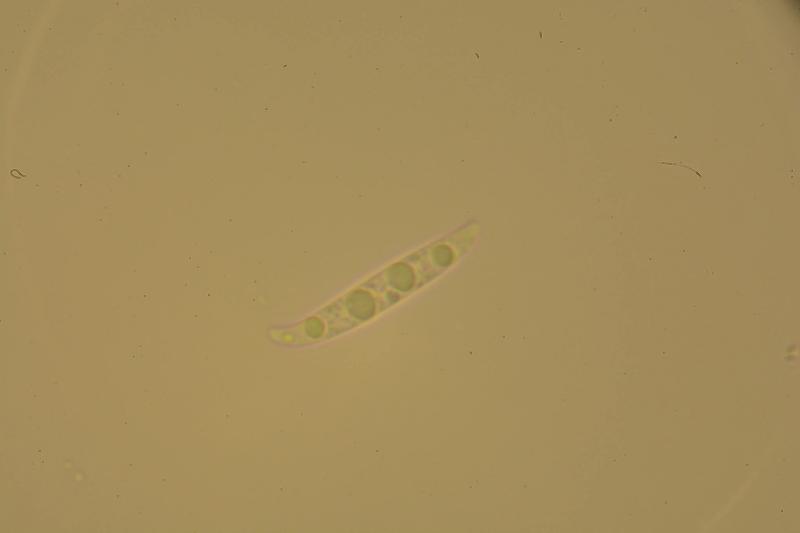 I haven't observed any reaction of the asci apex in Baral's solution. I haven't obtained any free spore print. Spores with 3 septa measured in water: