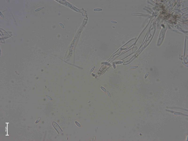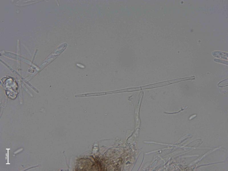 Disc 0.3 mm diam., grey-brown, surrounded by dark hyphomycete. Microscopy based on water mount of fresh material found in September 2025: Hairs hyaline, thin-walled, cylindric, straight, blunt, 3-septate, 63-83 x 2,3-3,0 µm. Minor amount of light-colored exudate may be observed on the upper part of some of the hairs, however, hard to confirm with certainty. Based on the macro-photo, the hairs look glued together into larger units. Asci 37-44 x 4,1-5,4 µm, cylindric, without croziers based on my interpretation. Sp. 6,6-7,7 x 2,1-2,6 µm; Q=2,7-3,3.