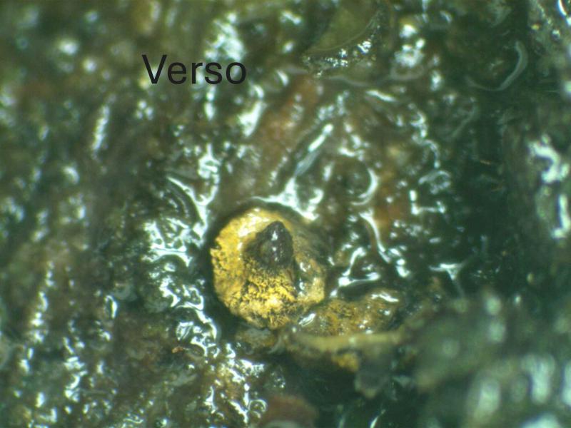 Disque de diamètre 2 mm, poilu verso jaune vif, recto brunâtre. Les poils sont bruns, septés, granuleux. Longueur supérieure à 100 microns.