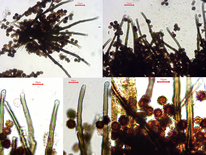 The "setae" (conidiophores?) are hyaline at the apex and blackish-brown below.
