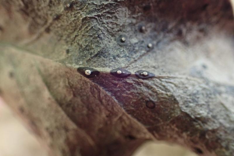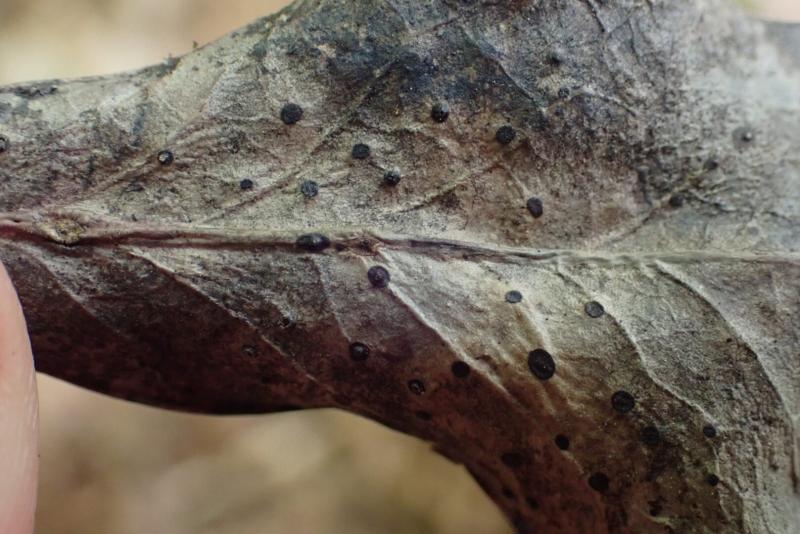 I found Trochila ilicina on Ilex aquifolium (1). Curiously, the part visible on the leaf undersurface happened to have white spots with a central small hole (2). Whilst separating the white part, a macroscopically visible cloud of white conidia escaped from the hole. Under the microscope, I could observe massive amounts of said conidia (3, 4). The conidiophores mostly consisted of just one conidiogenous cell, some were branched once. The conidia themselves measured 12,5 ± 0,4 µm × 2,3 ± 0,3 µm, Q = 5,6 ± 0,7 (5). Does anyone have an idea what species this could be?
