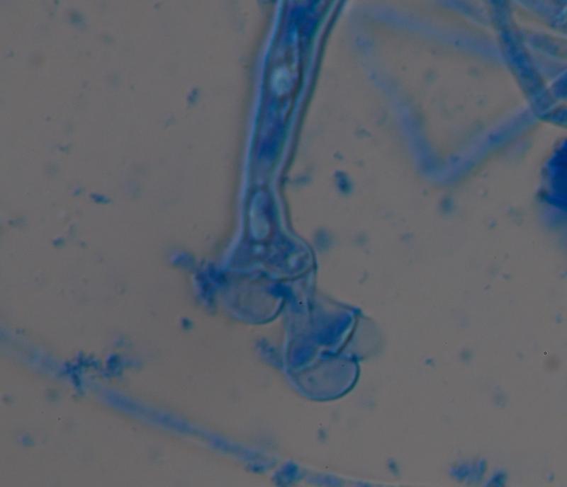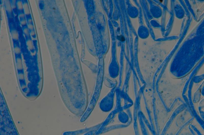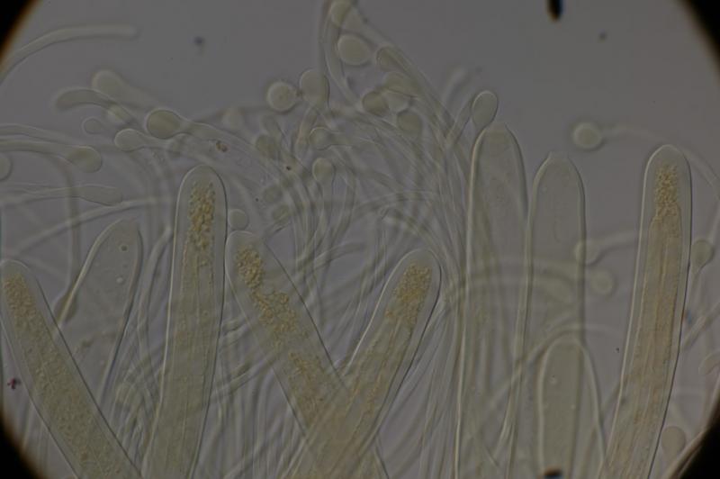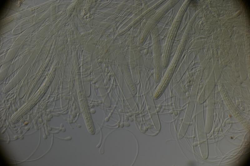 En cuanto a carcecteristicas microscopicas, es un registro muy reciente, pero por ahora esto es lo que he podido observar: esporas y ascos inamiloides, esporas filiformes y multiseptadas (hasta 15 septas). Las esporas miden hasta 181 x 5-7 um. El ancho de los ascos va de 17-19 um y presentan croziers en su base. Por ultimo las parafisis son fuertemente capitadas. Además me parece que los ascos son 4-esporados (el tamaño de las esporas dificulta por ahora ver bien este caracter).