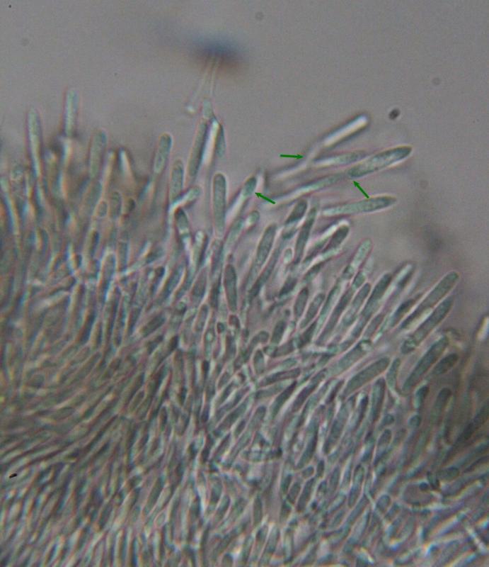This Pyrenopeziza grew in moist leaves of monocot. (Carex?) in a coastal lagoon in northern Spain. The apothecial margin is very briefly pubescent with short chains of cells with a clavate or broad bullet-shaped terminal element. Asci IKIb asci arising from croziers. Ascospores clavate with a broad obtuse base and a narrower, pointed apex. The lipid content is low or very low, consisting of only a few fine droplets near the poles (OCI=0-1) and remnants of a small apical gelatinous sheath that soon disappears (red arrowed). The paraphyses appear to have very little content and their apices possess an amorphous, almost hyaline or yellowish substance that reacts reddish in IKI. Excipulum textura globuloso-angularis texture of greyish cells.