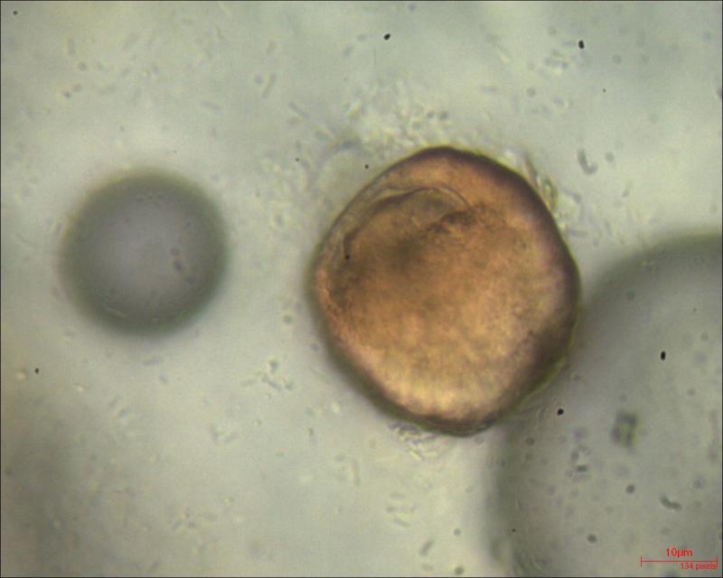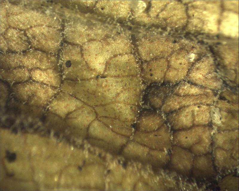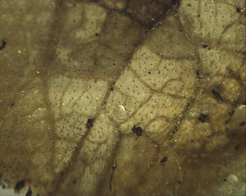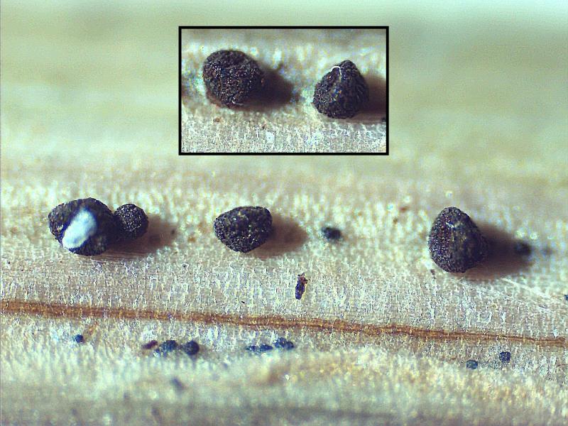 The fungus occurred mainly on the dark brown necroses in the leaf. Less frequently, it also occurred on the yellow zones surrounding the necroses. It consisted of orange, glassy Nectria-like spheres. Inside was a mass of cylindrical conidia, some connected in a chain-like manner.