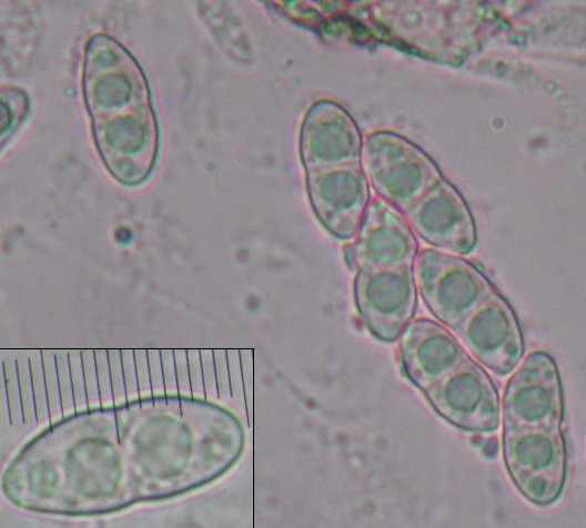 Asques unituniqués, spores bisériées :15-19 x 6-8 µm,uniseptées, rétrécies à la cloison, hyalines.
