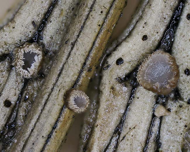 Good afternoonAnother little mushroom less than 0.5 mm on Echinospartum horridum, ascomycete-like, but basidiomycete, sessile, with greyish-white hymenium, covered with brown hairs become clearer towards the apex. I have seen very few bisporic basidia, and very few spores ellipsoid. It also has something like more or less clavate cistidia with diverticulated apex.