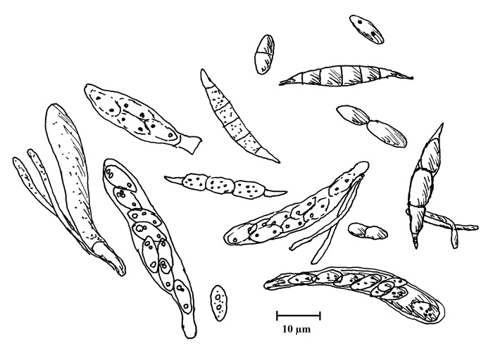 Diameter 0.5 to 1 mm. Maybe some Alternaria (Lewia)?