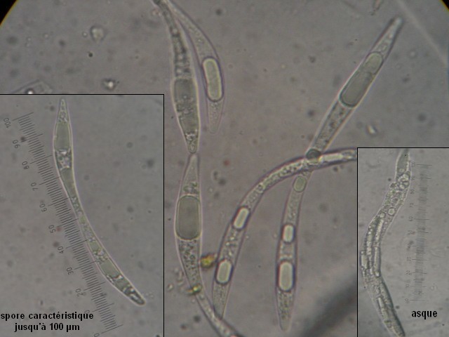 Spores hyalines77-82 X 6,5-7,7 µm centre rétréci 2,7- 3,2 avec une cloison. Avec ou sans guttules.