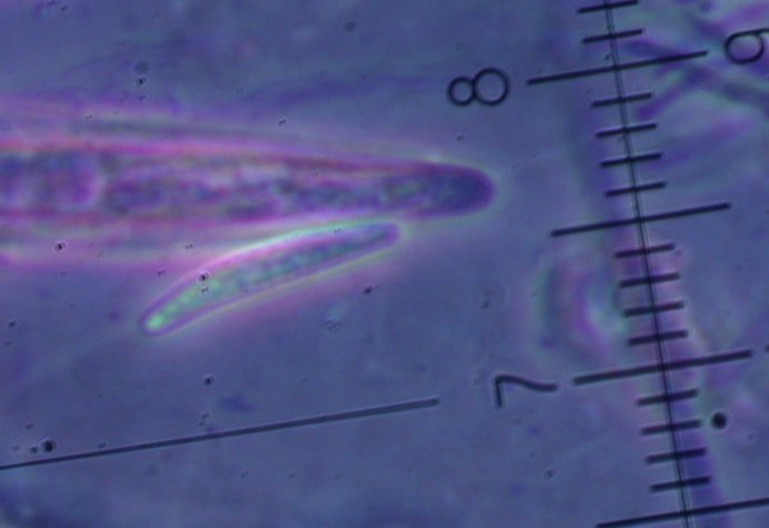 Spores 20-26 X 4-5 µm 3 cloisons parfois visibles dans l'eau, remplies de minuscules guttules très réfringentes (parfois sphériques ---> 1,5 µm)