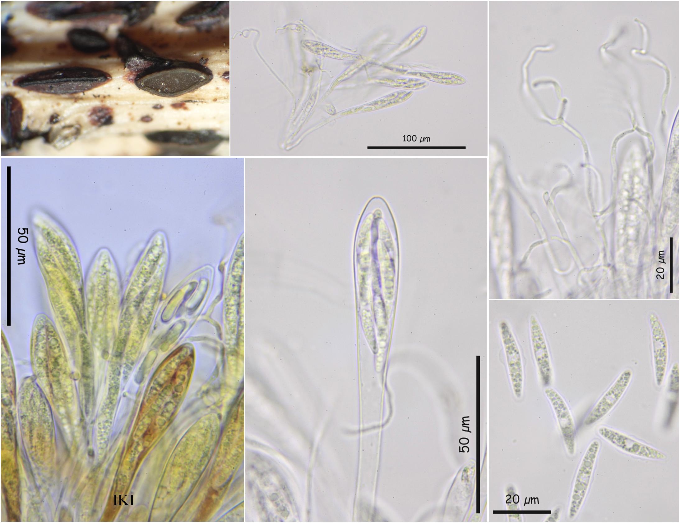 Este Hypoderma lo encontré hace unos días. Ascomas hasta de 1,5 mm de largo, creciendo en una ramita de Acer opalus subsp. granatense. Ascas de 144,94 - 160,54 x 12,77 - 14,07 µm, Me = 153,50 x 13,56 µm ; claviformes, IKI-. Esporas de (22,92) 24,20 - 27,55 (28,46) x (3,96) 4,41 - 4,88 (5,21) µm, Me = 25,89 x 4,62 µm ; Qe = 5,62, todas juntas en la parte superior de las ascas, no septadas, hialinas, generalmente algo curvadas, llenas de pequeñas gútulas de aceite, y envueltas en una capa gelatinosa. Paráfisis septadas, con el ápice más fino y muy curvado, muchas veces bifurcadas en el ápice.