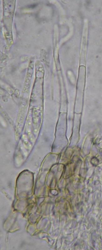 Asci 35-45 x 6-7 µm, pleurorhynch, pore amyloid. Paraphyses filiform with 2-2.5 µm diameter and sometimes slightly broder at apex. Spores variable in size and shape, mostly ellipsoid with two small drops, 6-9 x 2-2.5. Hairs straight or slightly sinuous, I measured up to 90 µm in length, basal cells slightly brownish (see photos).