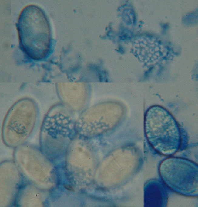 Dans le bleu coton chauffé, l'enveloppe se détache (très nettement, je crois que j'ai abusé sur le briquet) et flotte autour ( parties de reticulum flottant et spores comme lisses à côté).