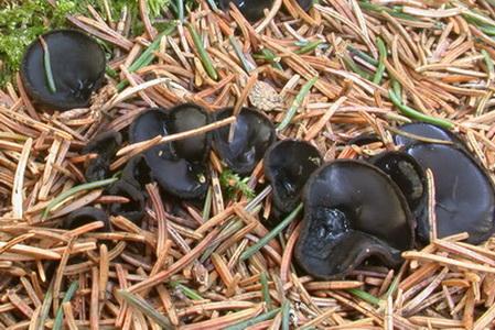 Apothécie cupuliforme mate, lisse, brun noirâtre, jusqu'à 30 mm sur litière d'aiguilles de Picea abies