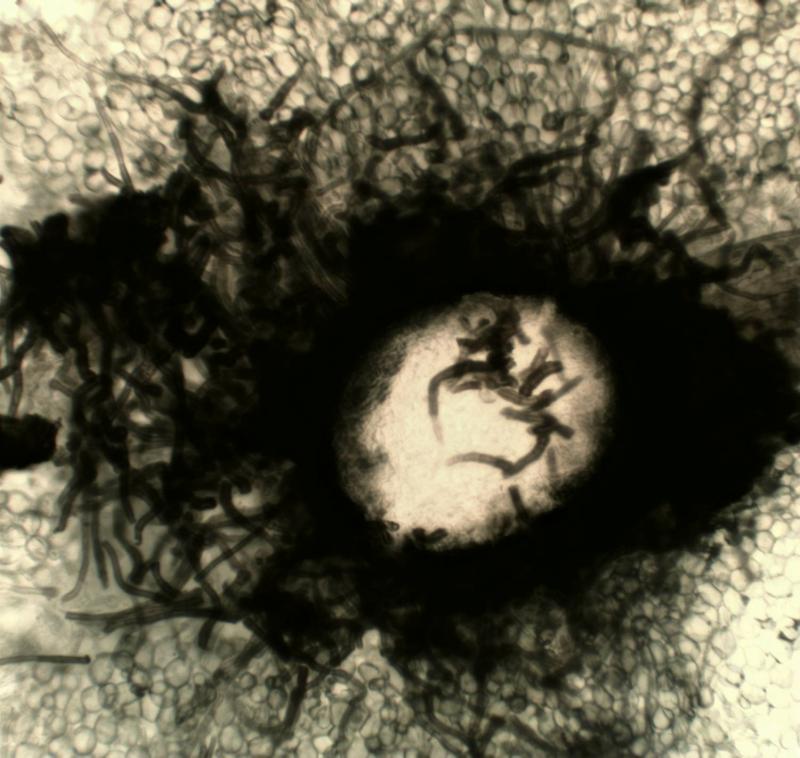 Mollisia hydrophila is perhaps the closest species, but I note that that fungus has abundant crystals (not the case here); also as I understand it those crystals are of the familiar octohedral type (again not the case here). In addition that species should show a KOH+ reaction. Plus, that species has basal pads of dark hyphae, whereas this fungus had an extensive subiculum, encircling the Phragmites stems. While I appreciate that presence of a subiculum is not significant at the generic level, surely it has some taxonomic significance at the specific level?