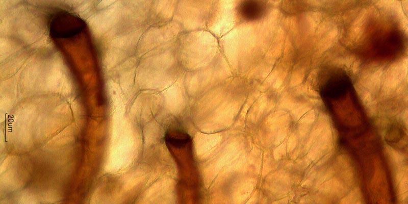 Pelos margen hasta 575 micras con base simple y algunos bifurcada.