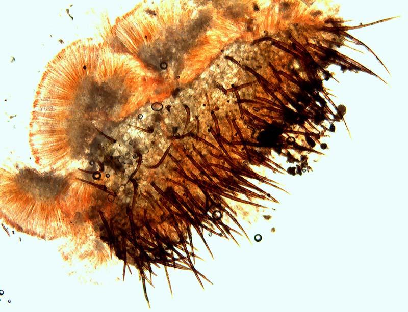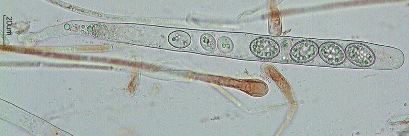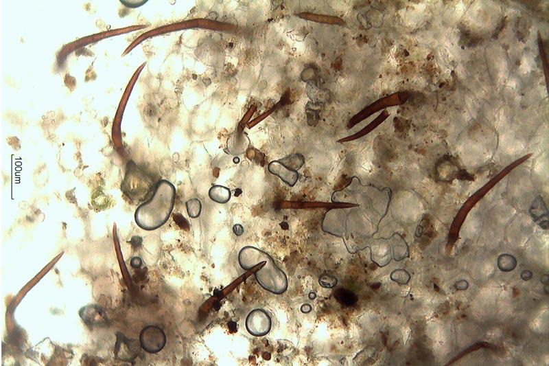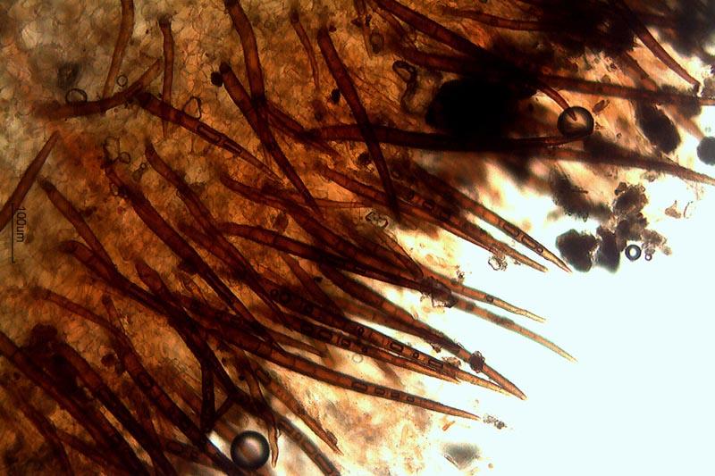 Su hongo parece haber sufrido, lo que puede causar algunas dificultades para determinar. Puede ser comparado con S.Nigrohirtula (sus fotos en algunas esporas son bastante estrecha). Tal vez usted puede encontrar copias más fresco.