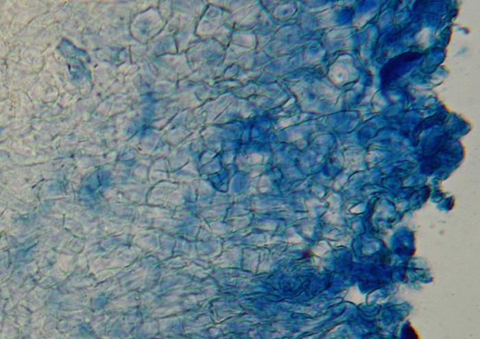 Medúlla of t. intricata, cca 330-370 um, ectal excipulum of t. angularis, up to 140 um, at the surface becoming t. globulosa, covered with sparse hairs. Hairs hyaline or yellowish, flexuous, about 50-135 (190) × 7-10 um, obtuse, 1 um thick walls.