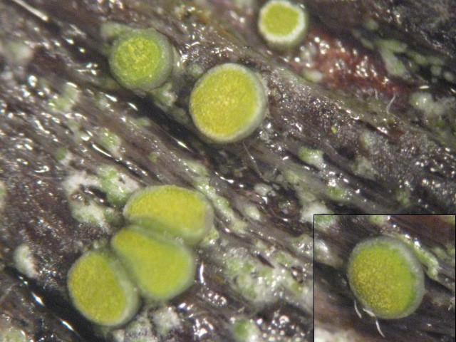 Sur la branchette de Juniperus sur laquelle j'ai trouvé Mytilinidion thujarum se trouvaient 3 discomycètes. J'ai commencé de regarder le plus attirant des 3, discomycètes d'un jaune citron de dépassant pas les 2 mm.