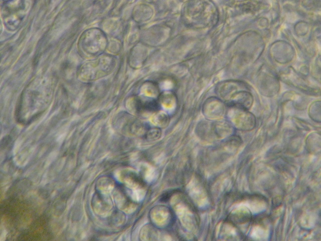 Comme le dit Nicolas, sans doute des spores de Caloplaca de type 1a. Les spores de Rinodina ne sont pas comme celles que nous présentent Alain.