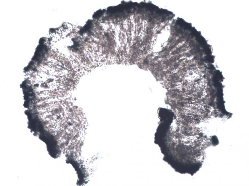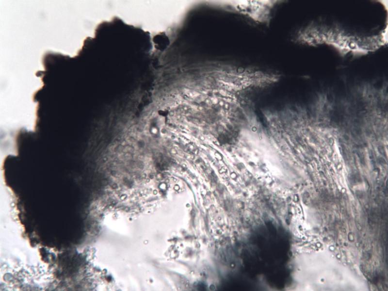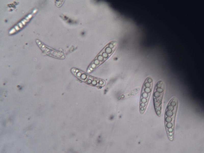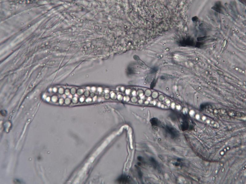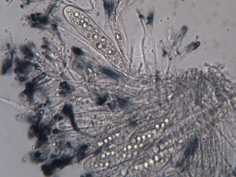 in the nearby sand dunes on an old piece of Arundo. The main differences for that species are the existence of a blue pigment in the epihymenium and the wider spores, for which got the following dimensions: