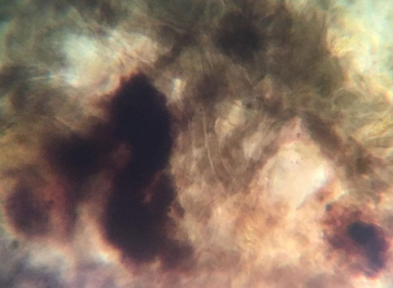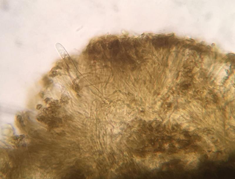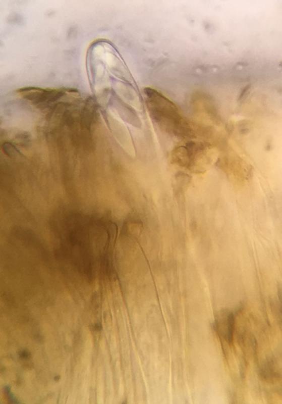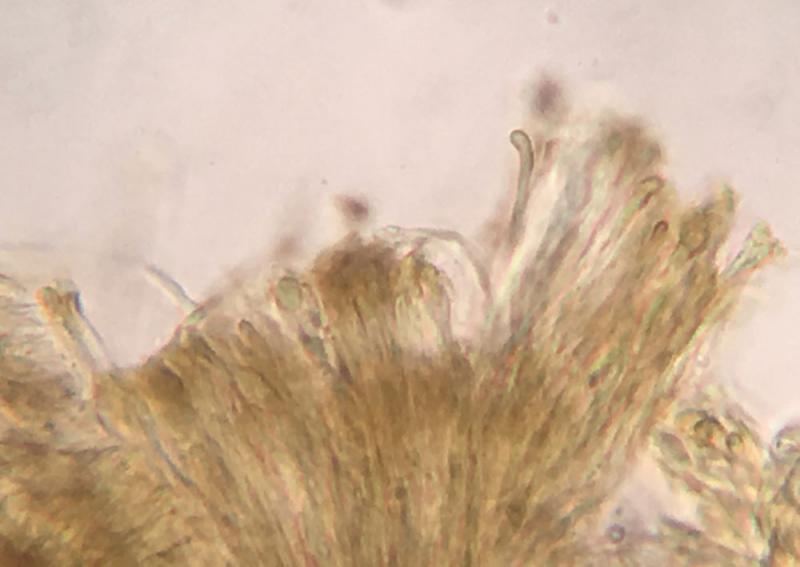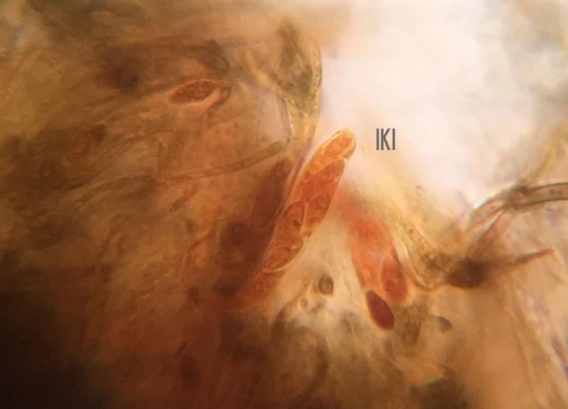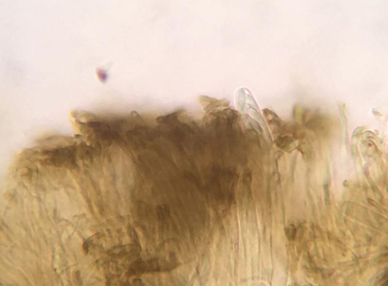 I went back to try to find living paraphyses, but I encountered a problem. I must have the fruiting bodies of a very similar (macroscopically) species on the same branch. When I prepared a slide I found microscopic features resembling the Skyttea-like asco with the muriform spores from 21-10-2018